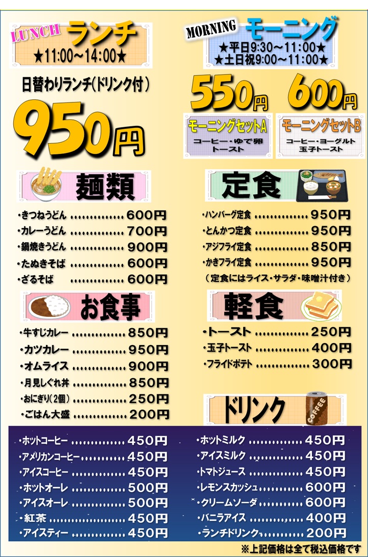 定食・軽食・麺類・ドリンク等ご用意しておりますので