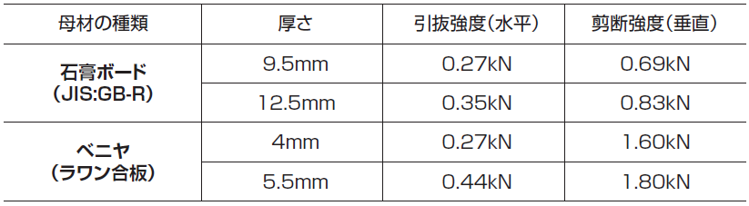 【商品の特長】 ・白色と小さく薄い頭部で、目立ちにくい施工が可能 ・取り付け時、粉やゴミが出にくく、壁紙のめくれも低減 ・保持強度がねじ込み式と同等、ビスも付属しコストパフォーマンスに優れます ・ねじ込み式のような、ねじ込み過ぎによる供回りの心配はありません ・ビスをねじ込む前なら、取り外した跡も小さく、位置修正も容易です 【使用方法】 【強度】 ※石膏ボードやベニヤの裏側に空間がある中空壁で使用してください。 ※硬質石膏ボード(JIS:GB-R-H)は使用できません。天井など下向き荷重方向は使用しないでください。 ※インパクトドライバーでの取り付けはしないでください。叩き過ぎ、締付け過ぎに十分ご注意ください。 ※引張強度及びせん断強度は母材の破壊強度です。 ※引張強度及びせん断強度は母材の種類、厚み、状態等母材自体の強度に大きく影響されます。 記載強度は保証荷重ではありません。施工条件、使用環境等を考慮して十分な安全率をご採用ください。