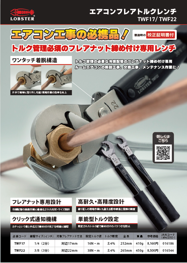 エアコン工事の必需品!トルク管理必須のフレアナット締め付け専用レンチ
